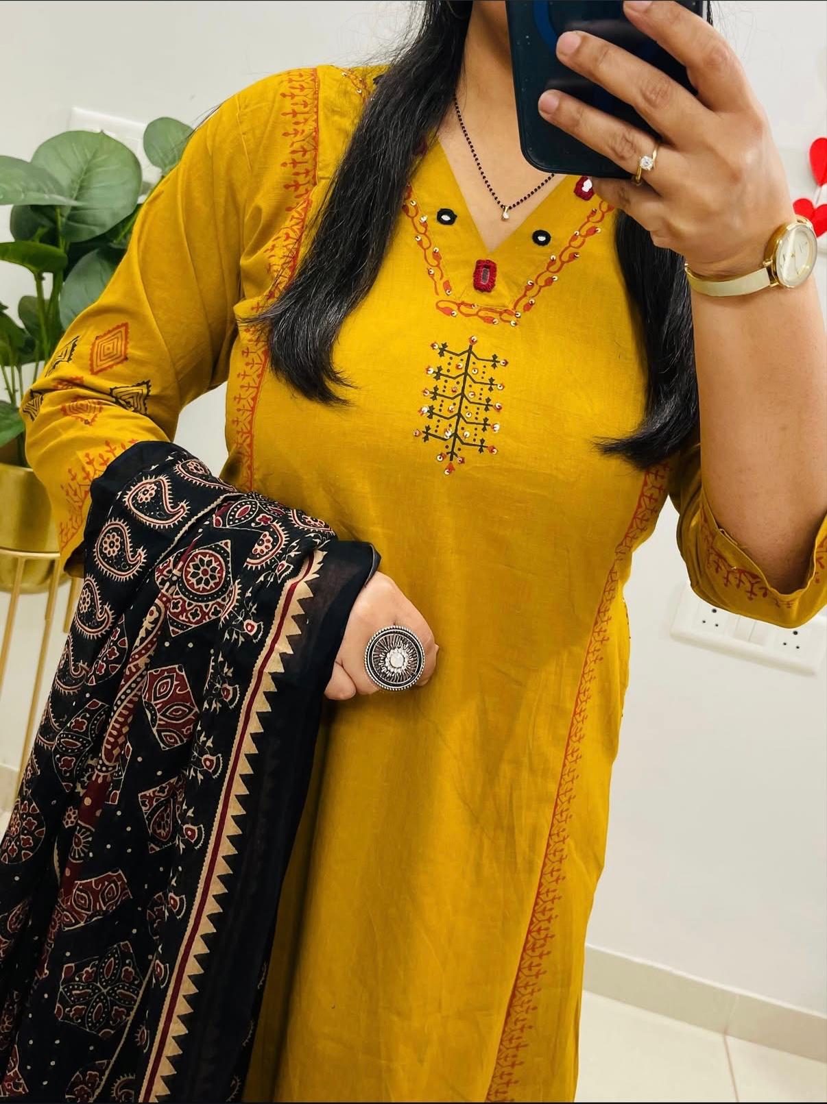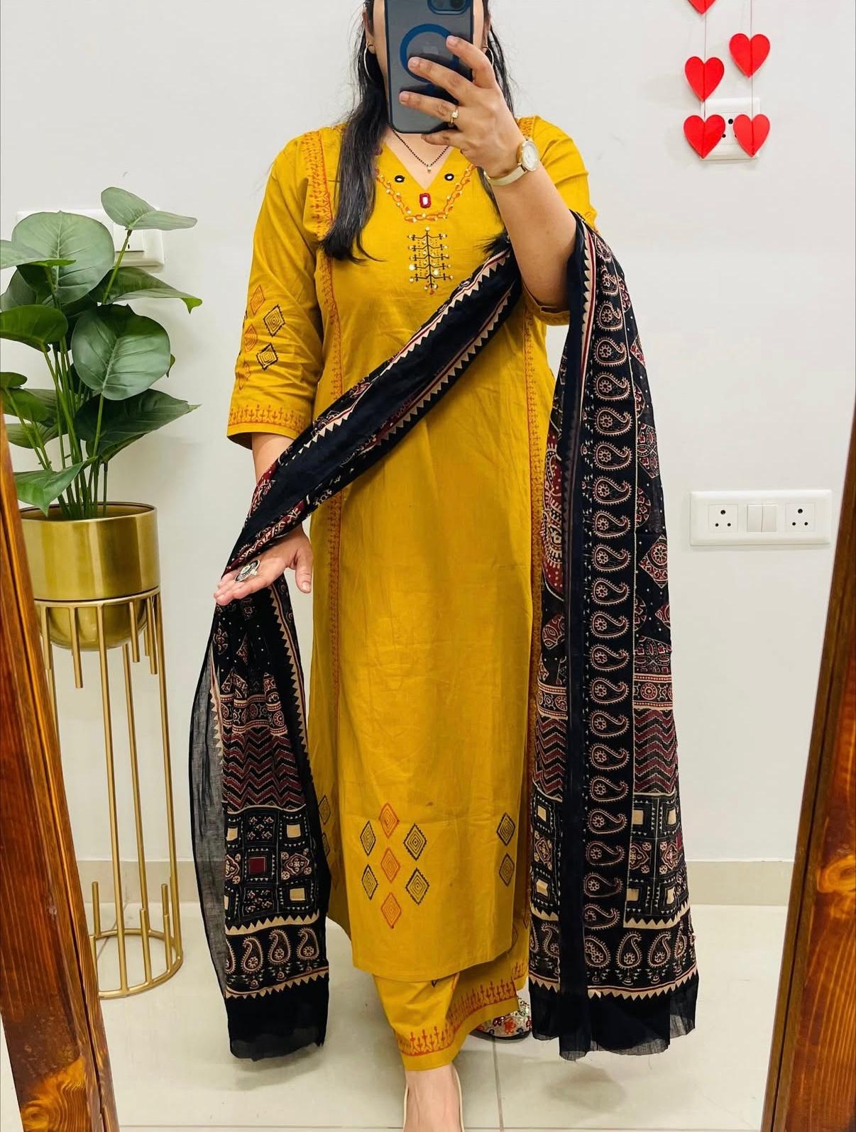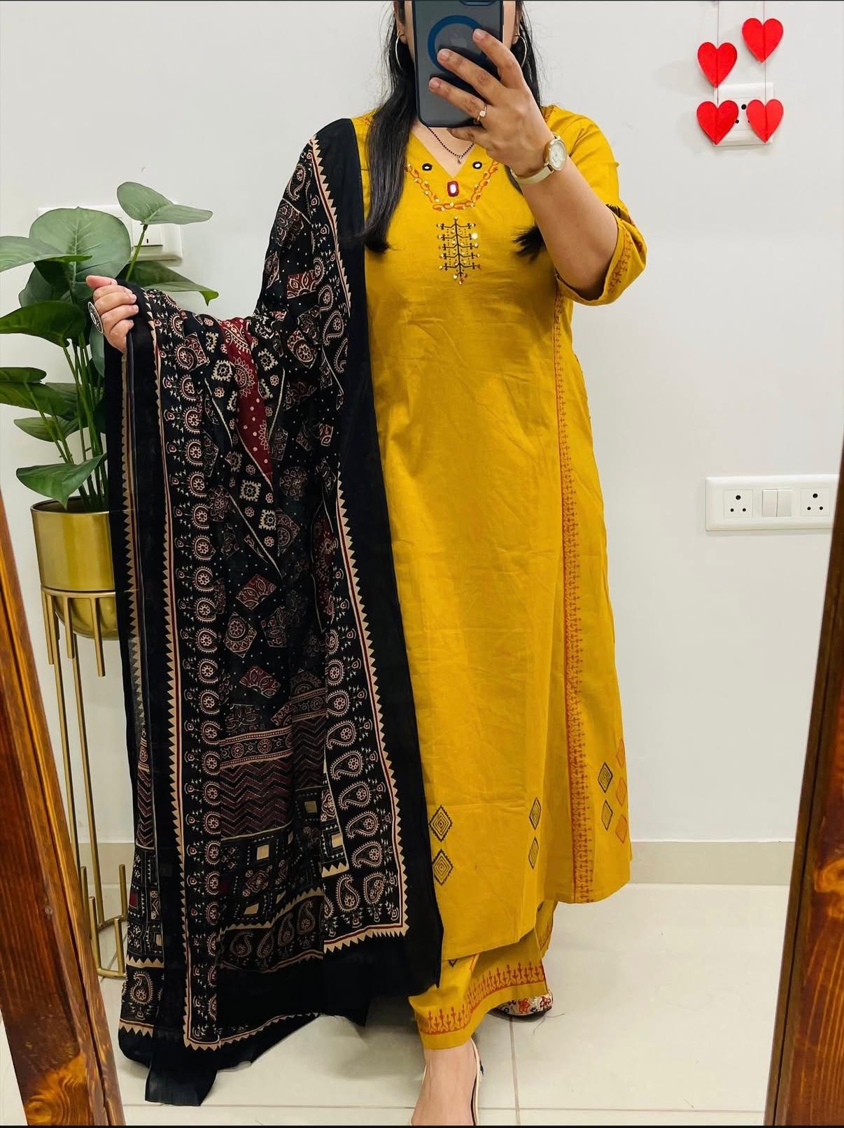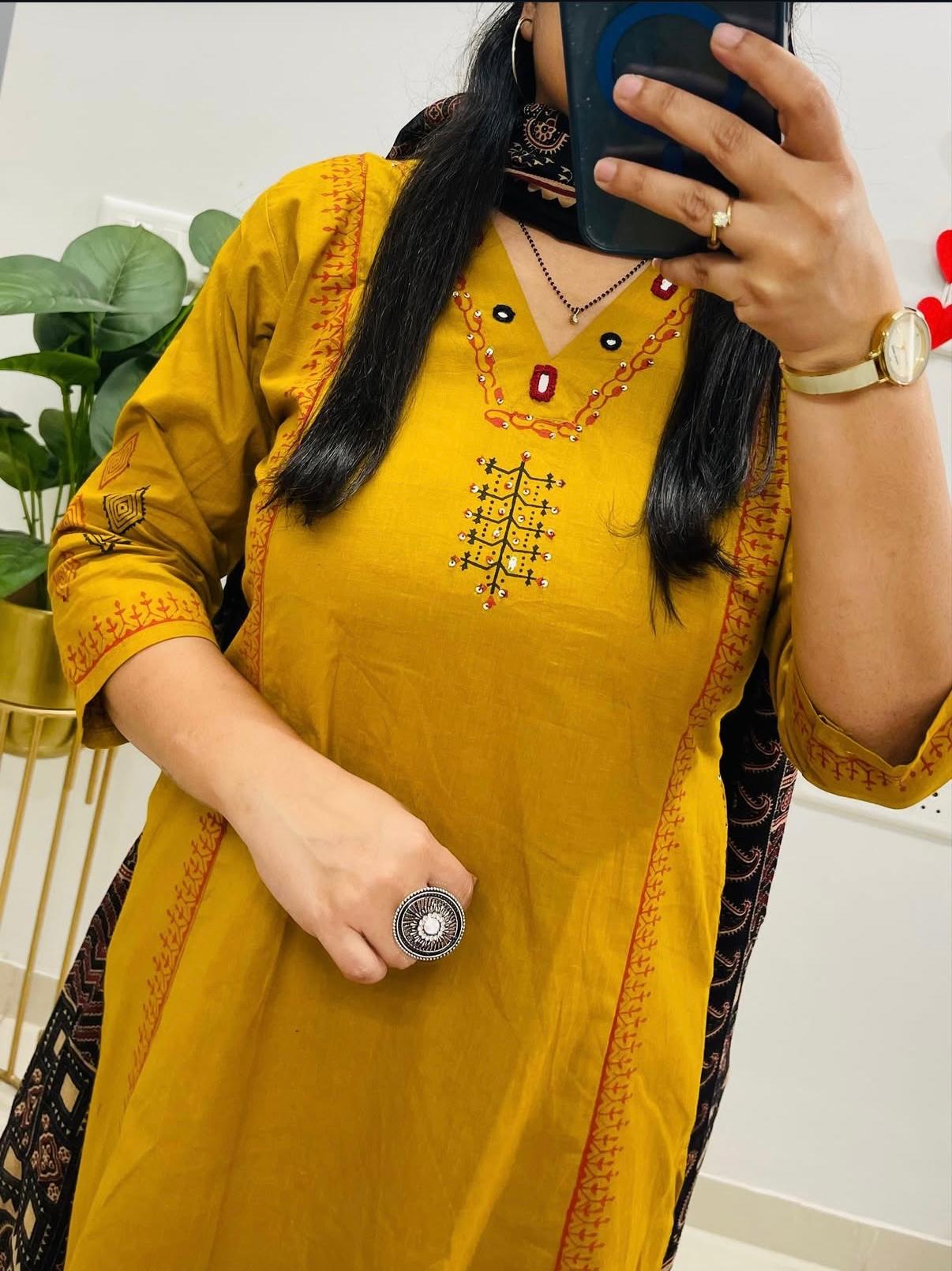 Add a vibrant touch to your wardrobe with this stylish mustard yellow kurta pant set with printed dupatta. Designed with elegant minimal prints and a contrasting black dupatta, this outfit gives a perfect traditional yet trendy look.