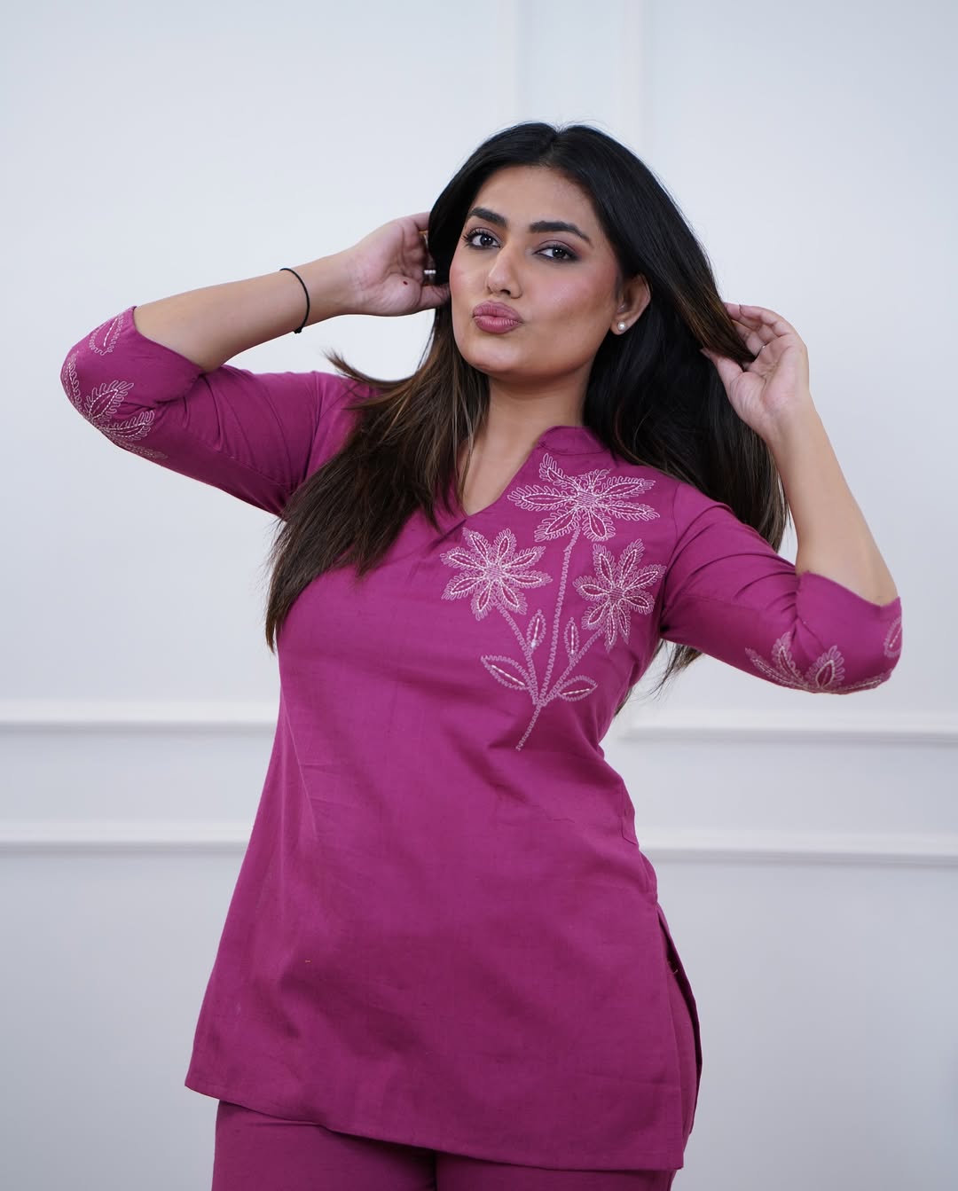 Add a modern ethnic touch to your wardrobe with this stylish magenta embroidered co-ord set, designed for comfort and effortless elegance. Featuring delicate floral embroidery on the kurta and pants, this outfit offers a perfect blend of minimal design and graceful detailing.