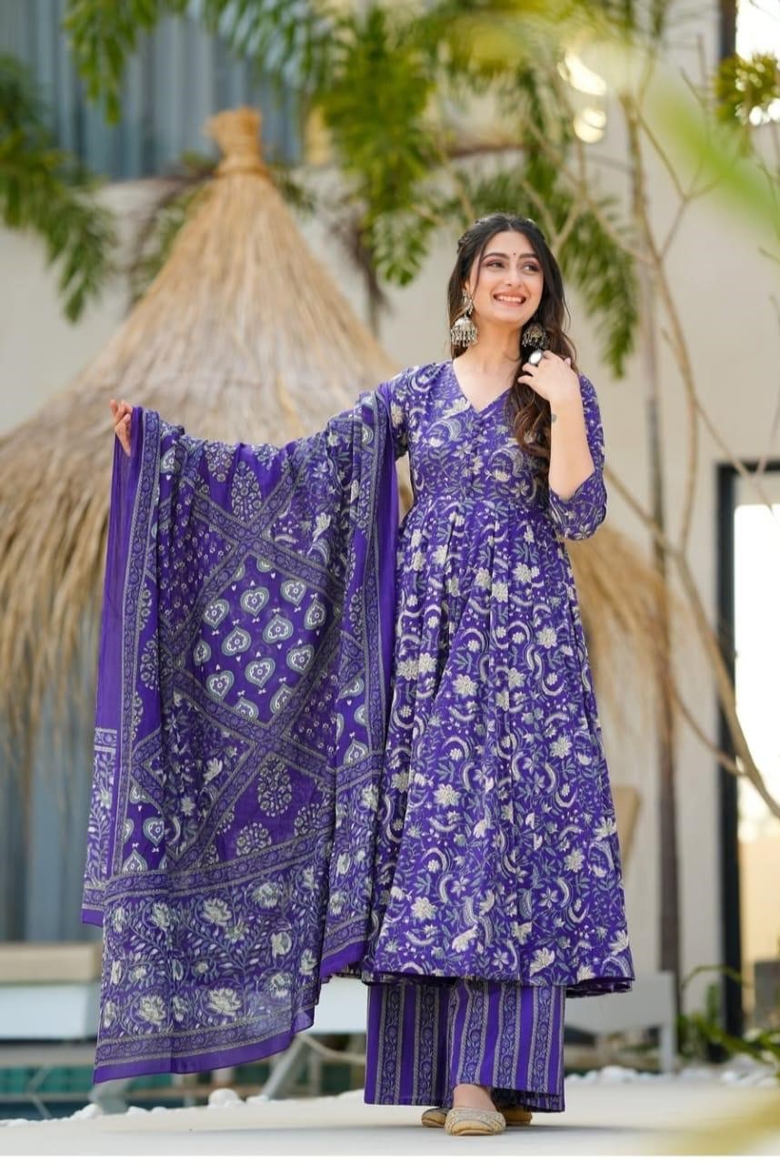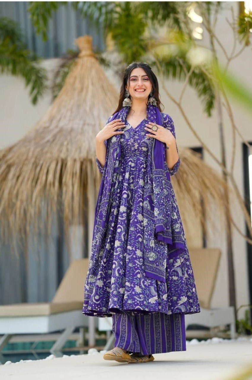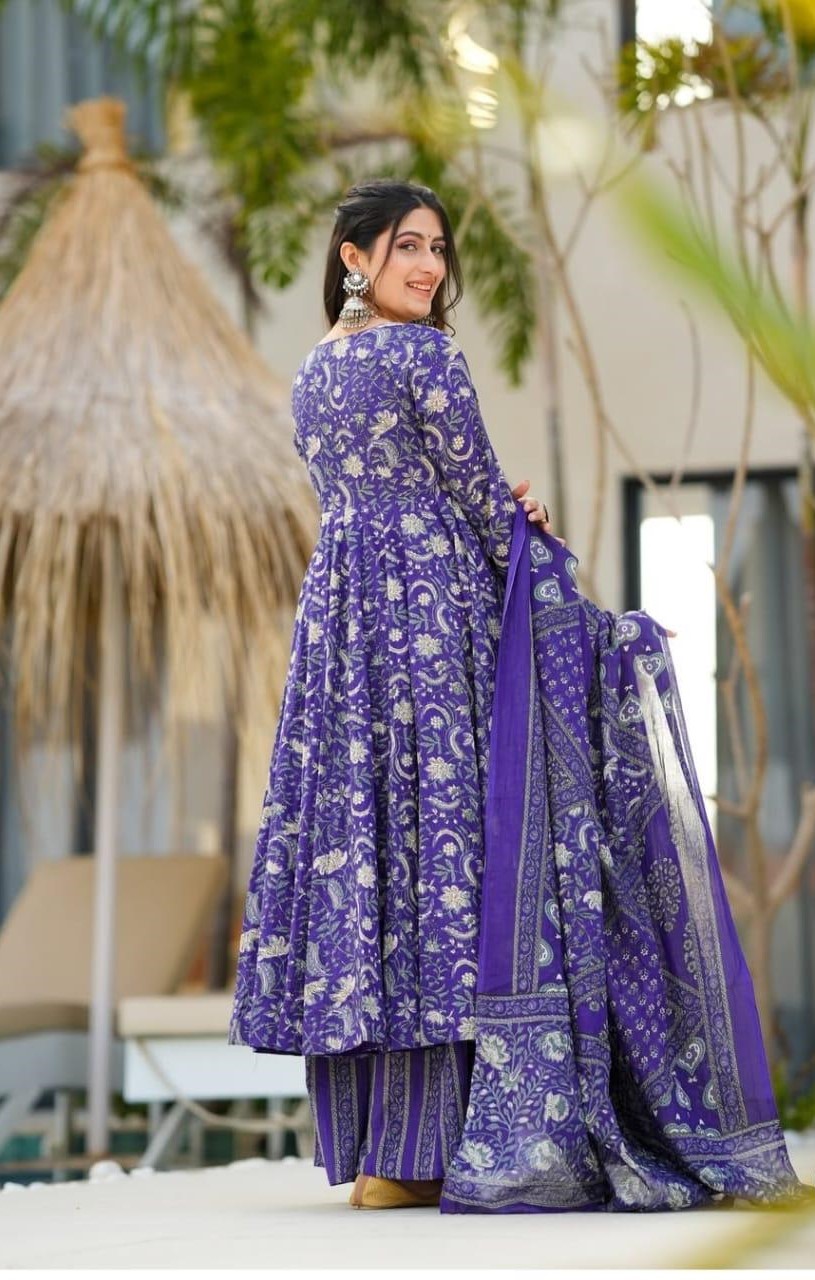 Make a bold ethnic statement with this stunning royal purple Anarkali suit set, beautifully adorned with intricate floral and traditional prints. Designed with a flattering flared silhouette, this outfit offers graceful movement and a regal look perfect for festive celebrations, wedding functions, and special occasions.