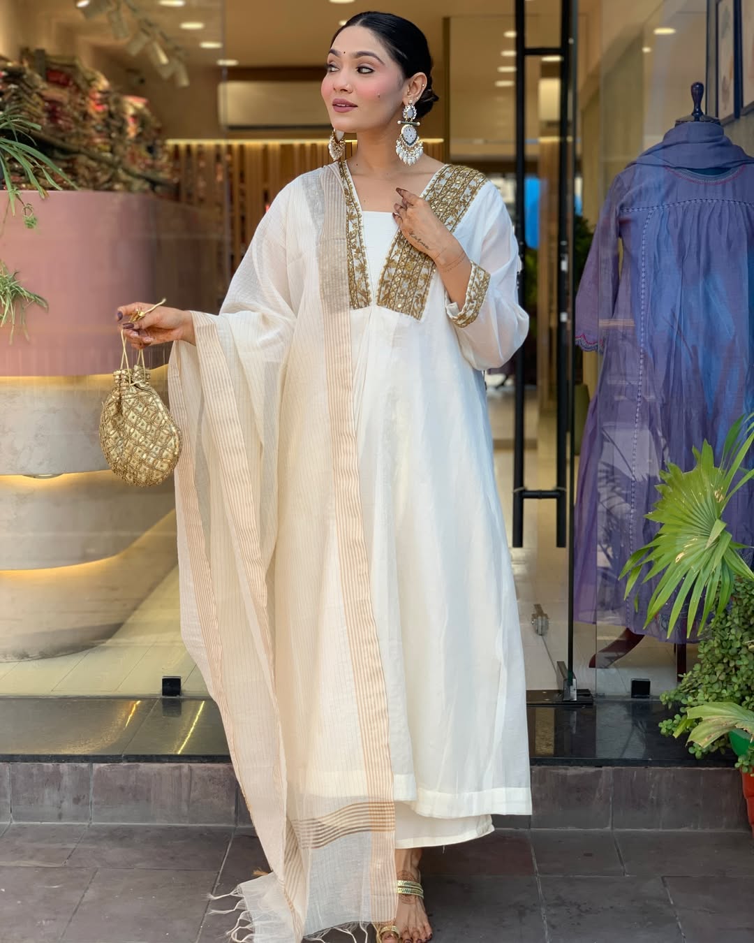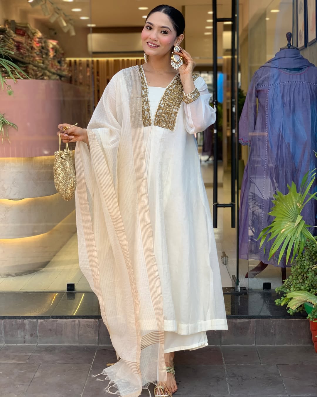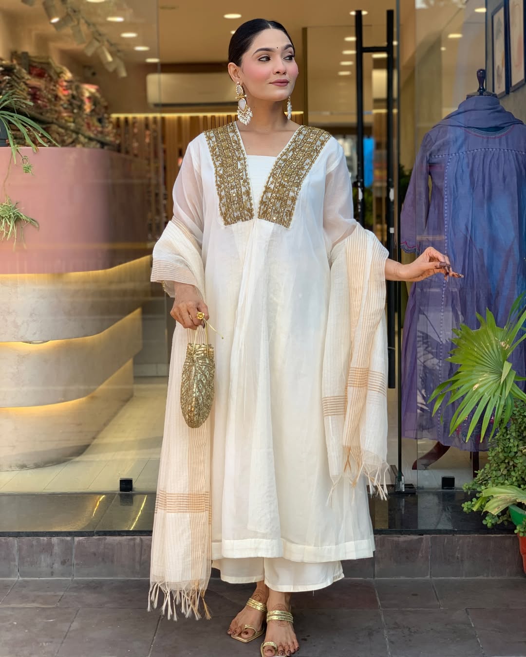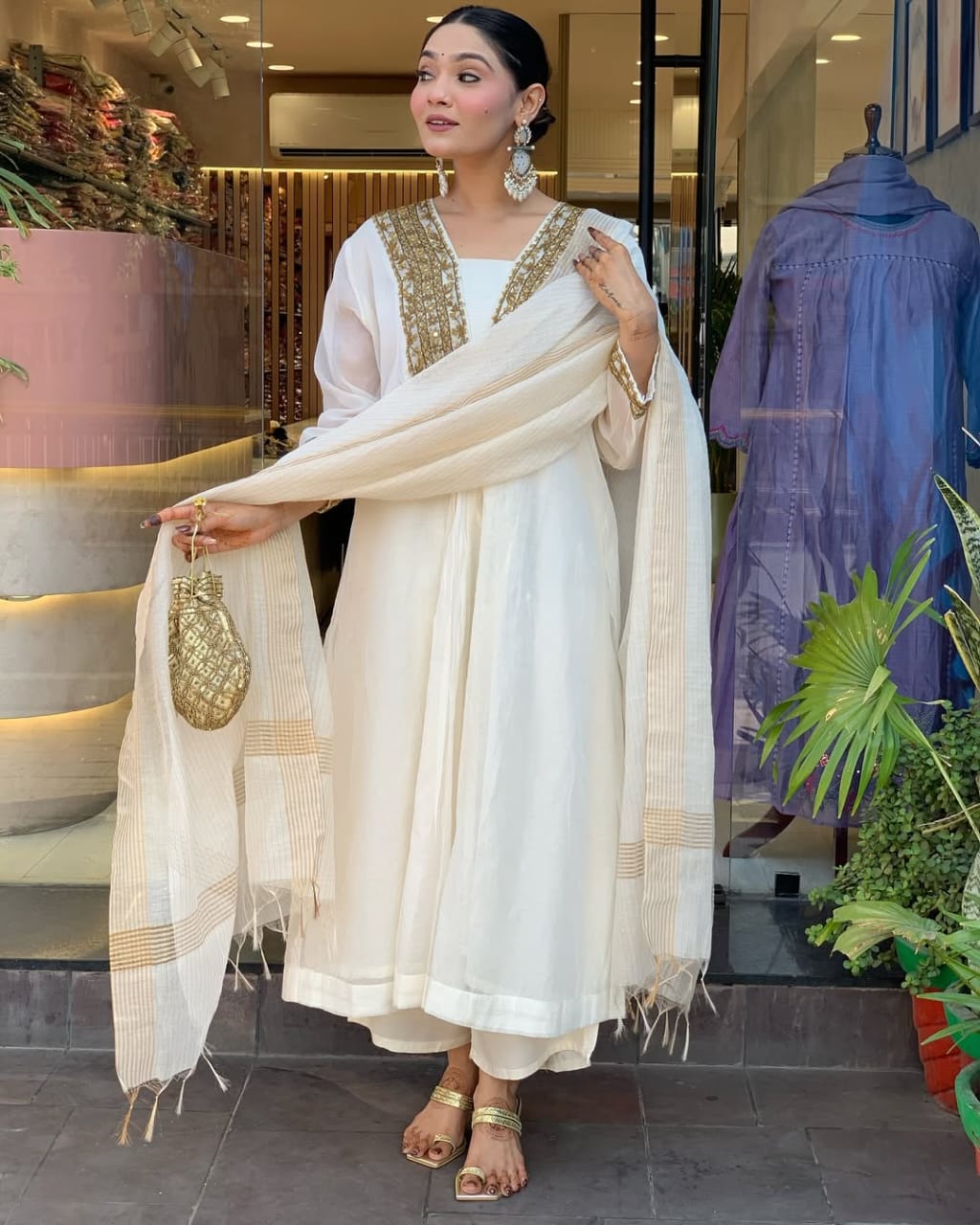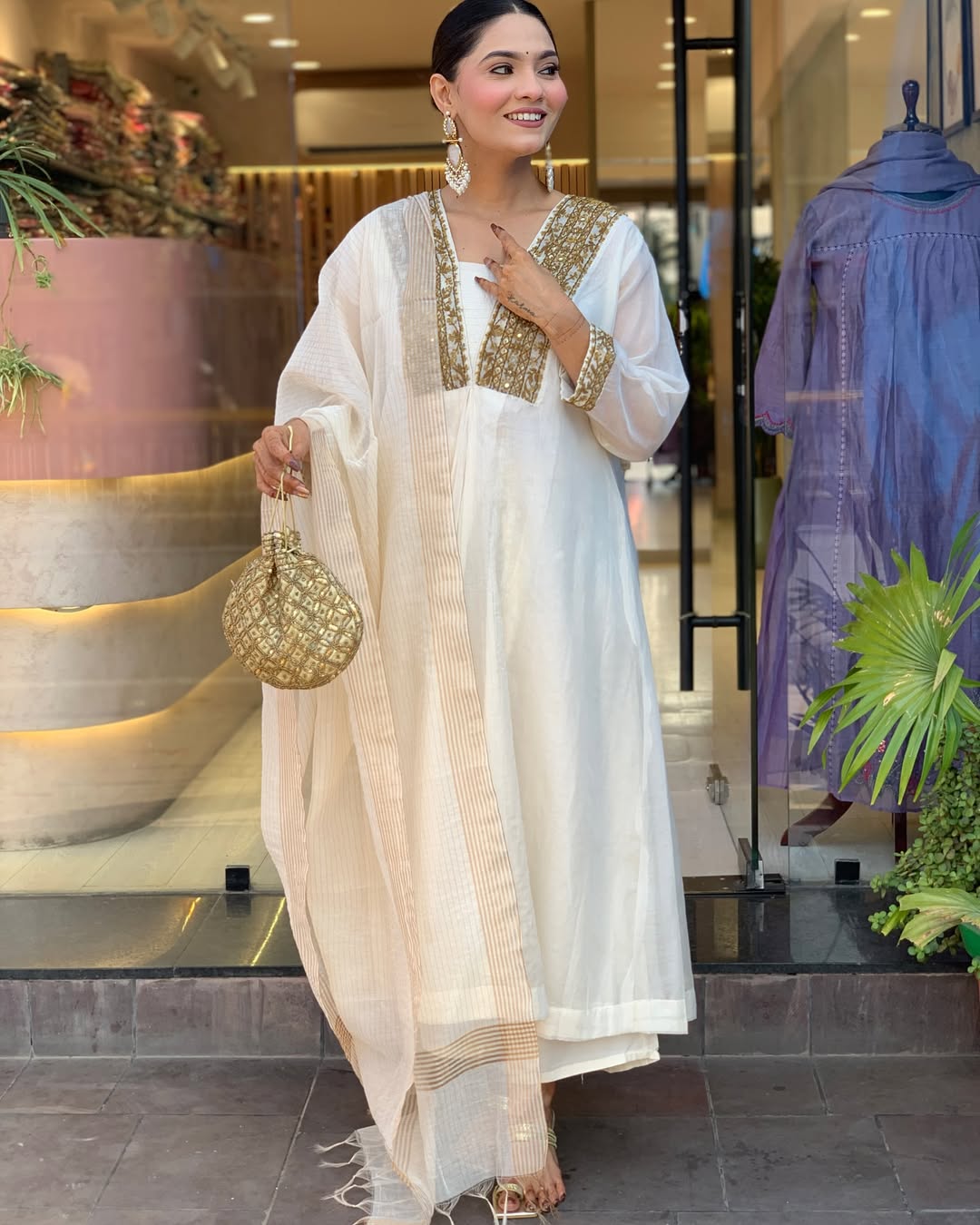 Step into timeless elegance with this beautiful white and gold embroidered Anarkali kurta set, designed to give a graceful festive and ethnic look. Featuring intricate golden embroidery on the neckline and soft flowing fabric, this outfit reflects classic Indian craftsmanship with modern sophistication.